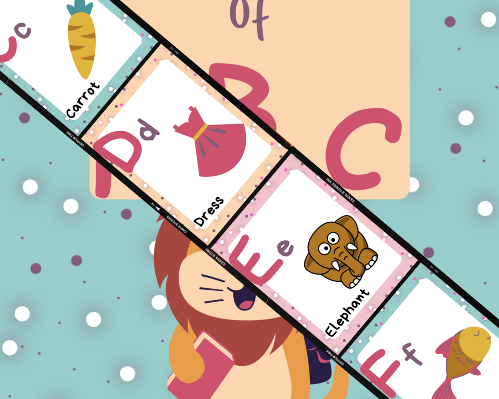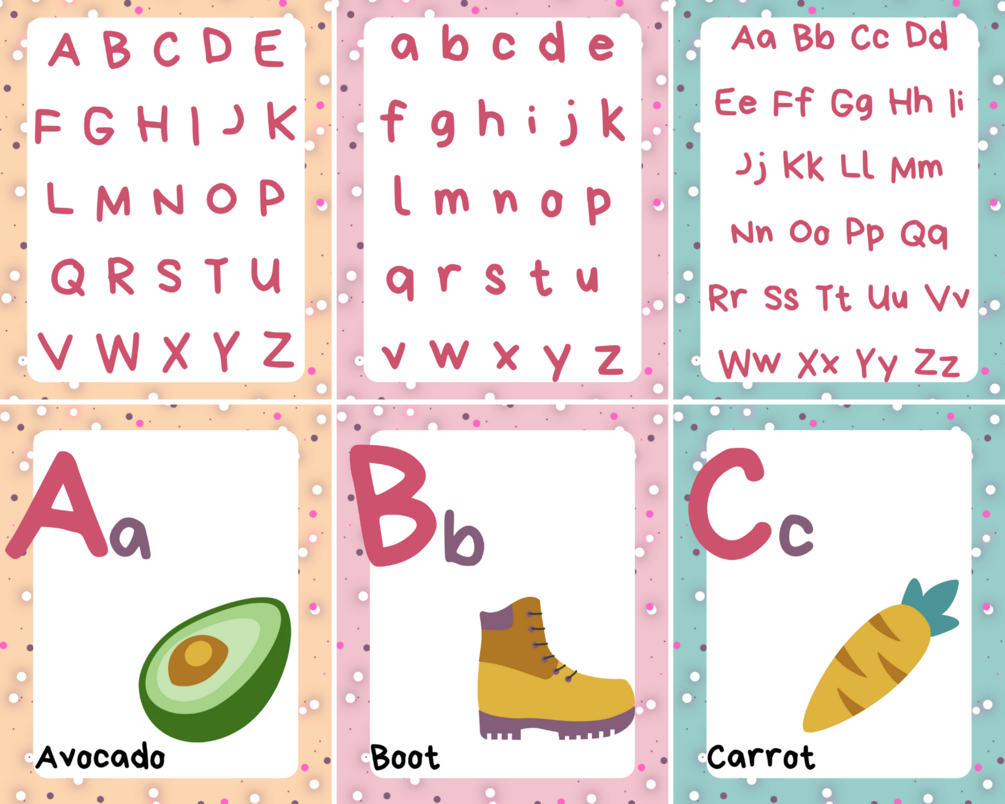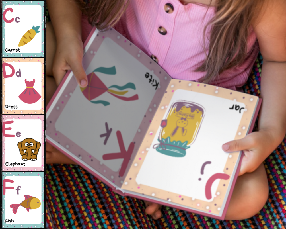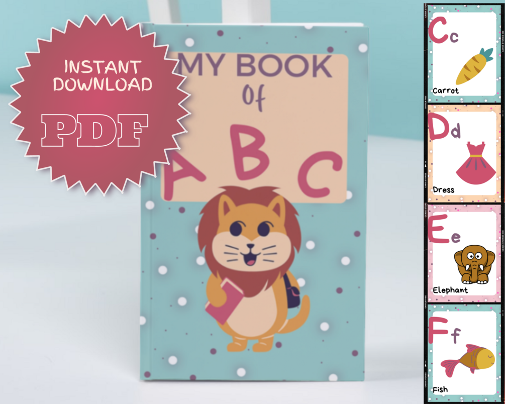 This digital children book contains the letters of the alphabet, both uppercase and lowercase as well as examples of household items, pets, easy to remember nouns that start with each letter.